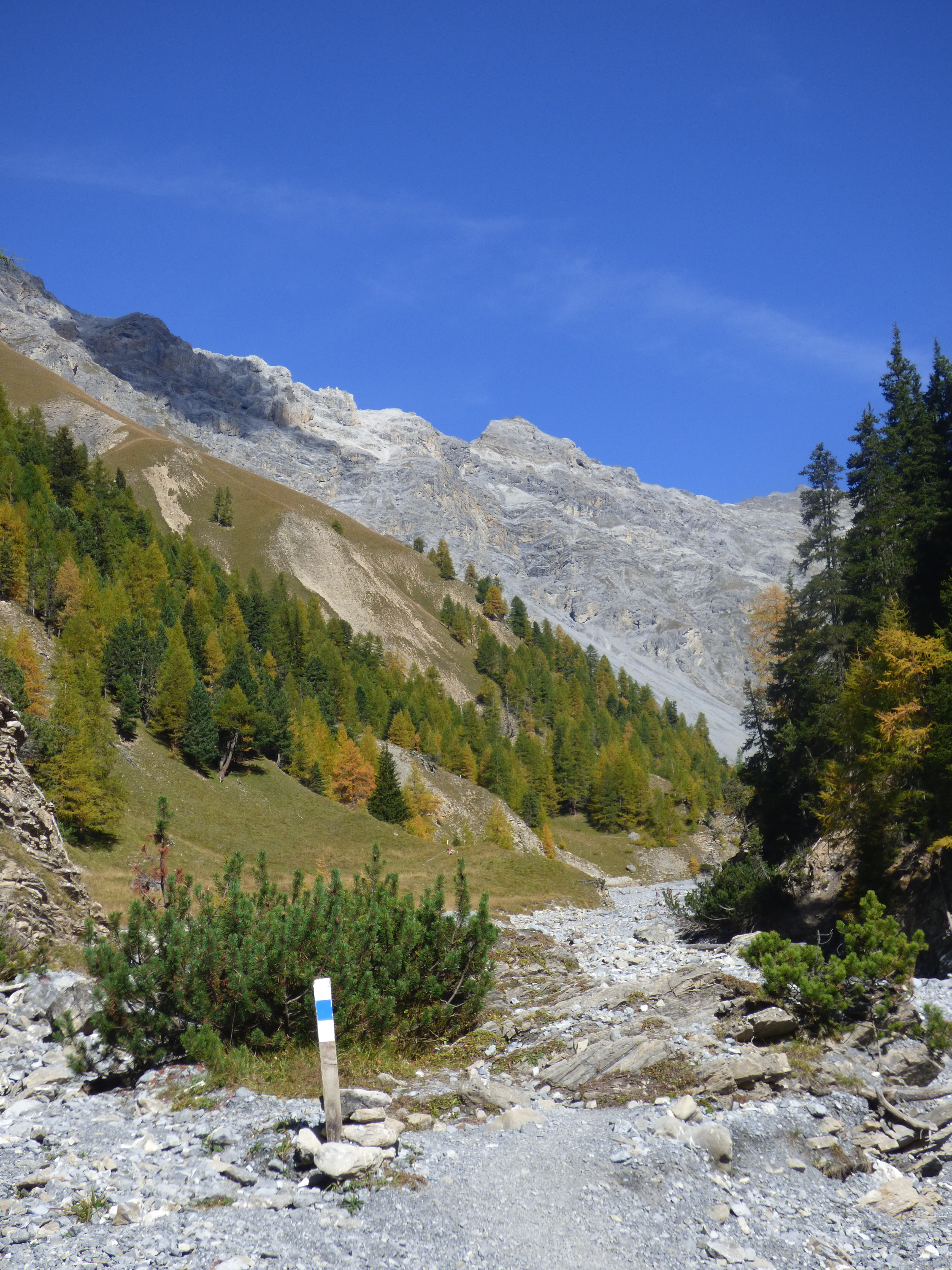 Am nächsten Morgen gings früh Richtung Val Trupchun. Ich wählte den linken Flussweg um ins Tal zu laufen. Ein bisschen fühlte es sich an, wie wenn man zu einem Open-Air-Konzert läuft. Der Parkplatz war schon gut besetzt. Grössere und kleinere Gruppen, junge Familien und Paare liefen auf dem Wanderweg gemeinsam in eine Richtung. Je tiefer man ins Tal vordringt, desto eher erreichen die Ohren einzelne Tonfolgen des Konzerts und jeder hofft voller Spannung, den ein oder anderen Orchesterspieler sehen zu können. Gemeint sind die brunftigen, lautstarken Hirsche.
