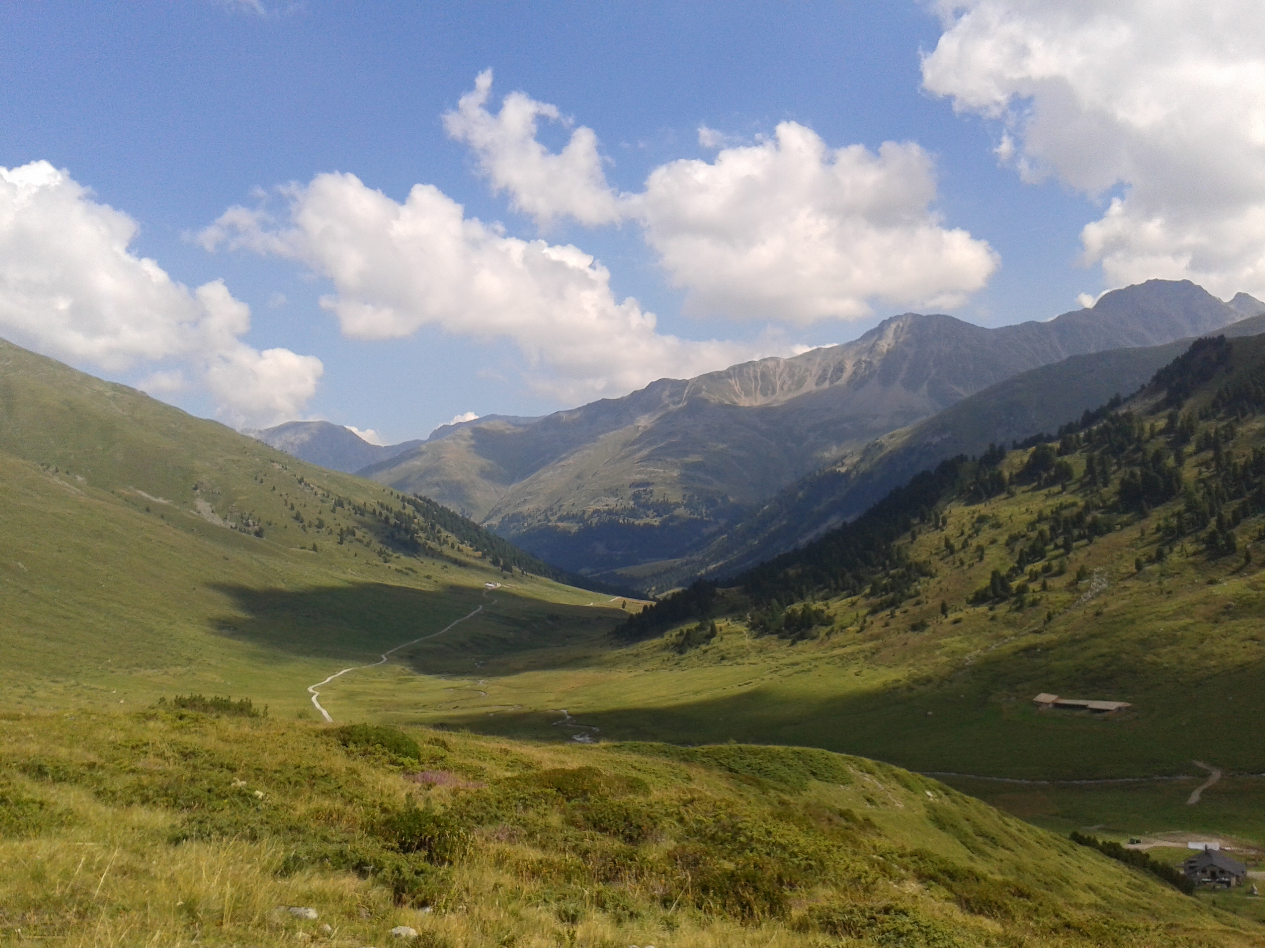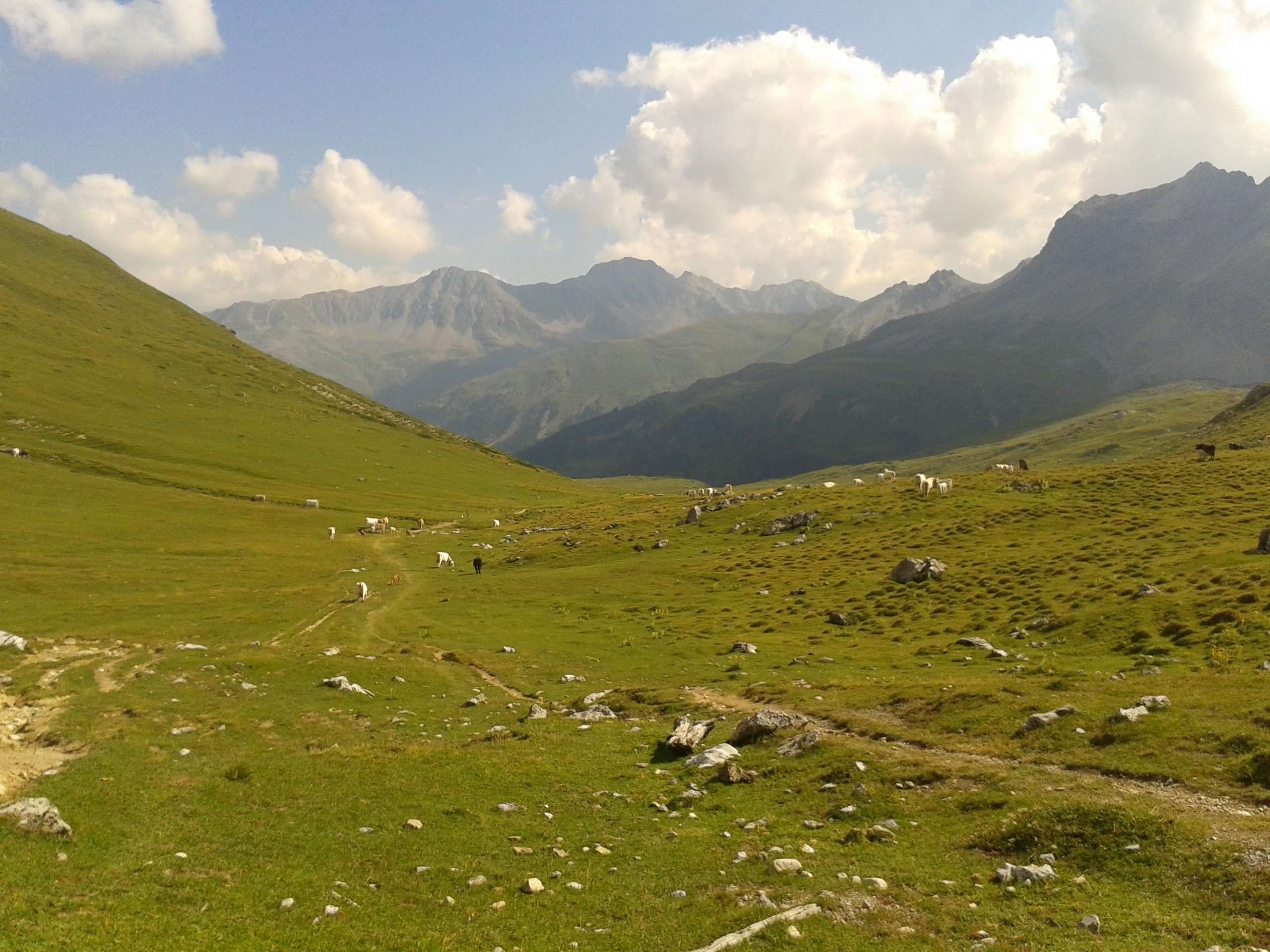 Am Fluss entlang verläuft der Weg gemächlich zum Pass hinauf. Es ist heiss, doch sobald eine Wolke die Sonne verdeckt, wird es kühl. Oben angekommen führt der Weg zügig hinab und ich schwenke nach rechts zur Alp Champatsch, die sympathisch und unkompliziert ihre Gäste bewirtet. Selbstgemachter Kuchen erwartet mich.