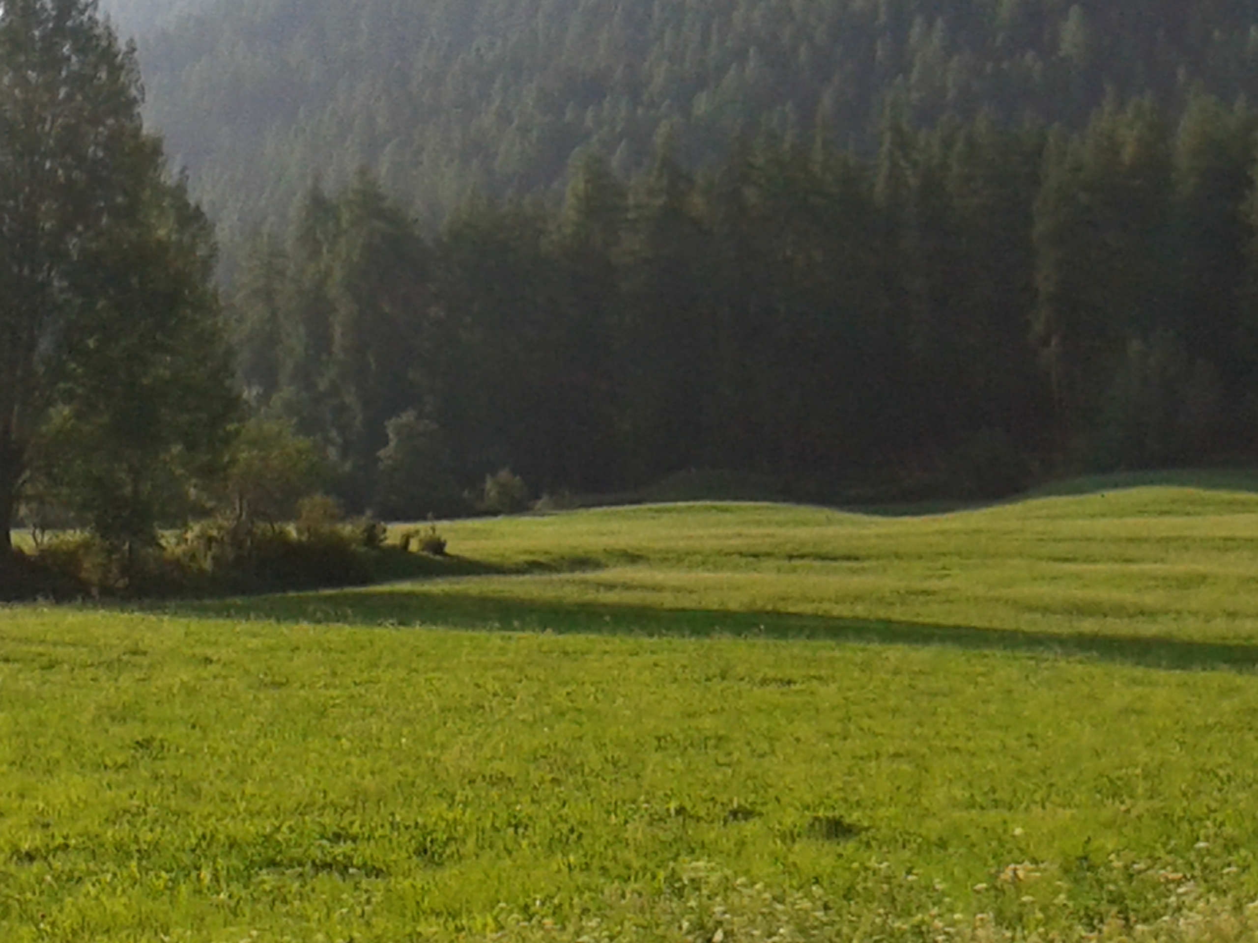 Wann immer ich hier bin, führt mich mein Weg zu dem „vergessenen Haus“. Es liegt am Dorfrand, das Gras ums Haus steht auch diesesmal hoch. Die Türen und Fensterläden sind fest verschlossen. Vorbei an der mächtigen Lärche, dem wild wuchernden Apfelbaum und dem Kirschbaum, gehe ich hinter das Haus. Dort steht eine Bank, ein Tisch und es wartet auf mich die Aussicht auf das satte Grün der Wiesen, dahinter der Lärchenwald bis hinauf zu den Felsen, und weiter zum endlosen, blauen Himmel…es ist friedlich und still.