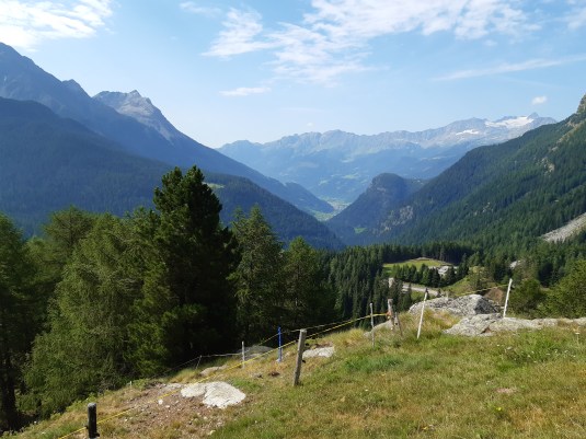 Mir bleiben 4 Minuten, um nach meiner Ankunft in Pontresina den Rucksack zu packen, Wanderschuhe anzuziehen, Parkuhr füttern und aufs WC, bevor mich der Bus Richtung Tirano nach La Rösa bringt. Der Wanderweg zieht sich an der westlichen Talseite entlang, bis man auf die Fahrstrasse stösst und zu all jenen, die dem Ruf „Saoseo“ zu Fuss folgen.