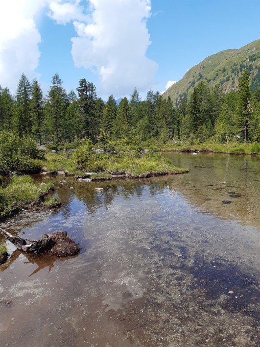 Von meiner geplanten Route weiche ich ungewollt ab und werde durch einen traumhaften, wilden Zauberwald geführt. Alte Lärchen und Arven, Felsen, Bachläufe und kleine, verträumte Seen. Herzlichen Dank für diese glückliche Fügung.