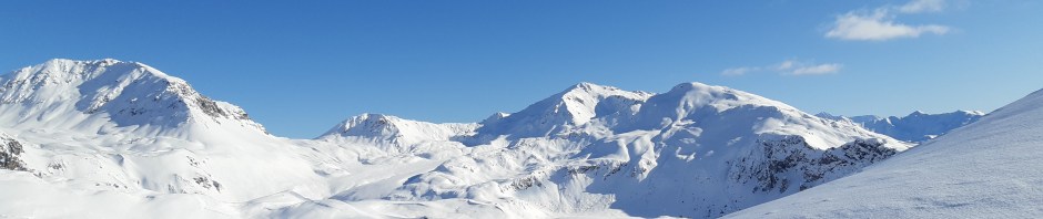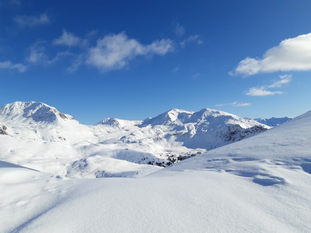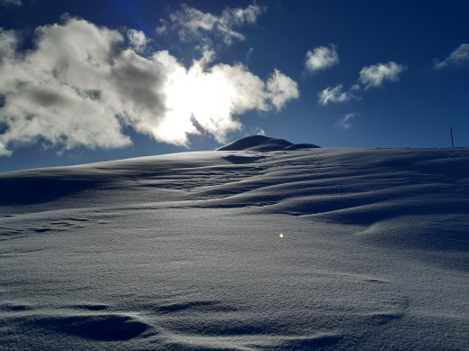 Im Tal noch Herbst und grüne Wiesen und oben am Berg strahlendes Winterweiss.