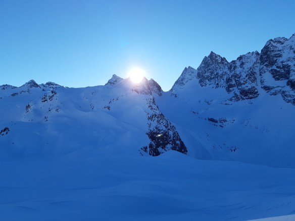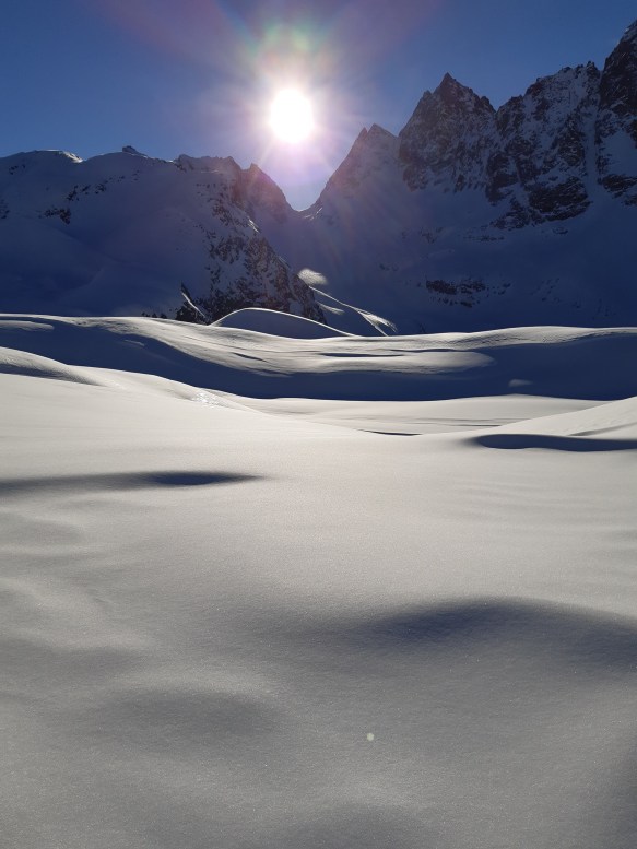 Und die atemberaubende Aussicht auf die tief verschneite Bergwelt. Friedlich, unberührt und still.