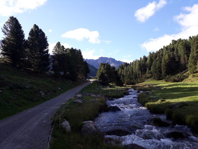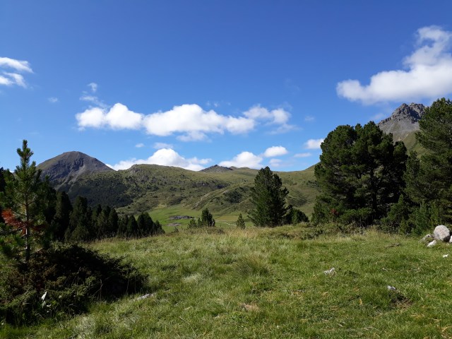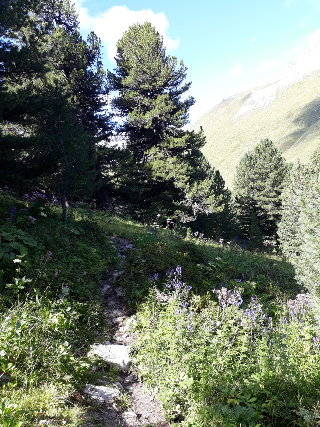Hier oben auf dem Sentiero Panoramico sind nur wenige Wanderer unterwegs. Der abwechslungsreiche Weg schlängelt sich westlich des Tales die Hänge entlang, hin zur „Schwelle zum Paradies“, wie einst der Maler Giovanni Segantini sagte.