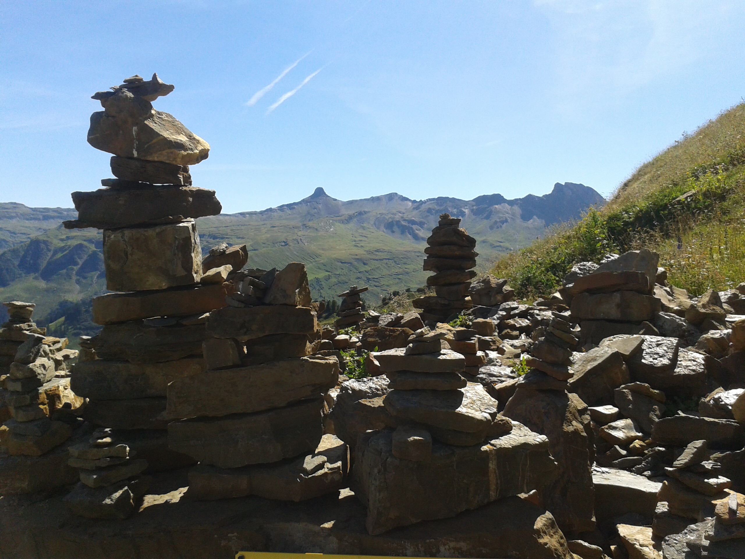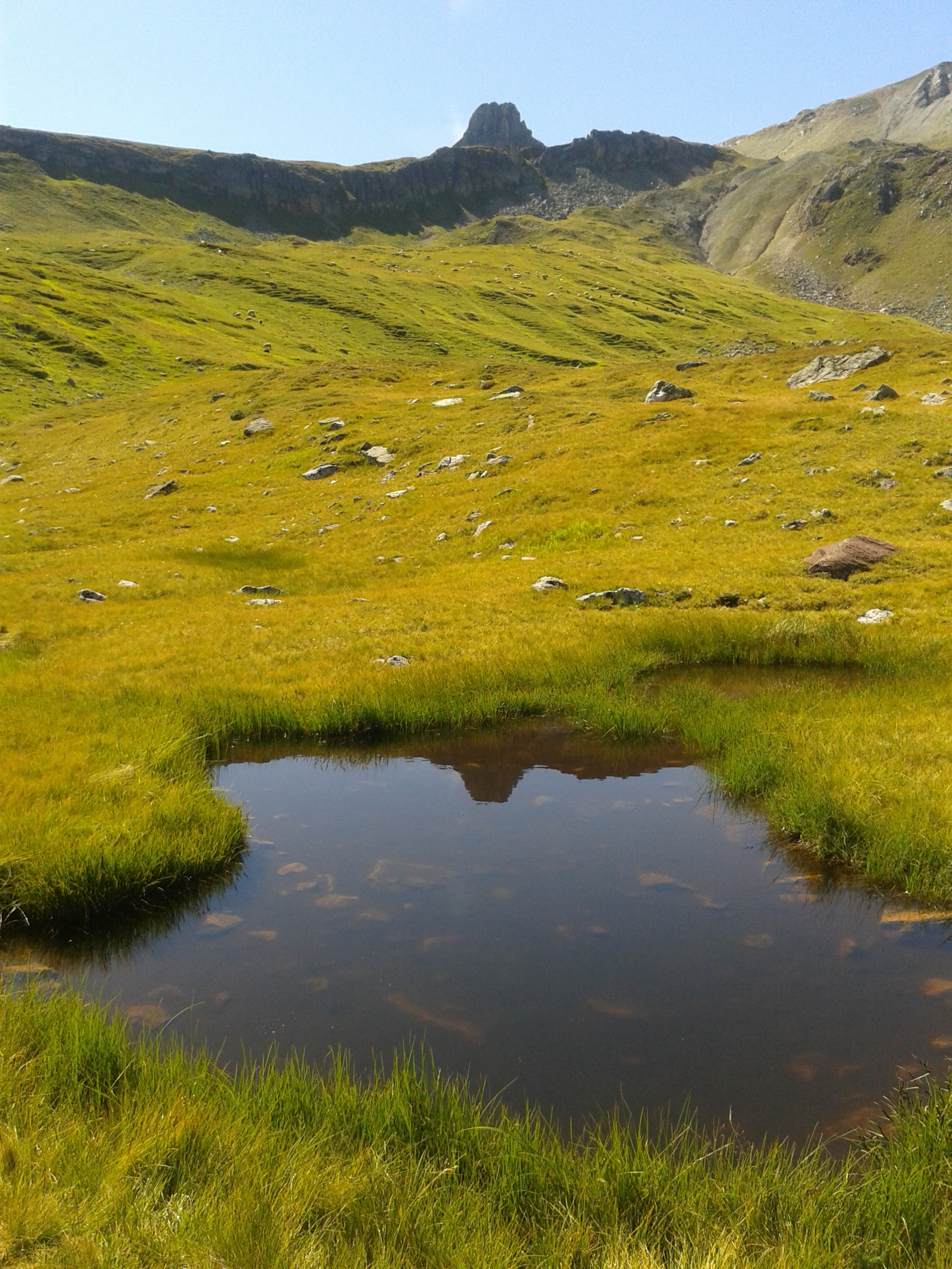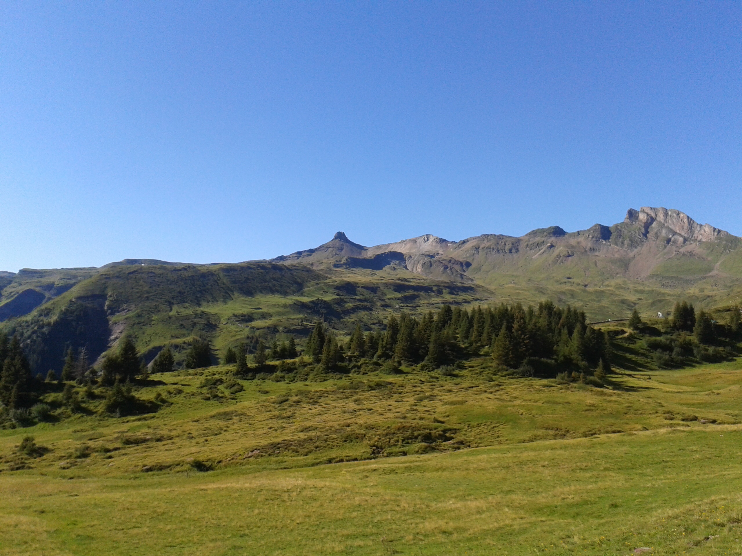 Es war eine langer Weg mit Höhen und Tiefen, sympathischen Begegnungen, durch karge Landschaft und durch wunderschöne Lärchenwälder und vorbei an frisch gemähten Wiesen. Durch ein kleines friedliches Dorf und rechtzeitig versorgt mit frischem Quellwasser, als mein Vorrat zu Ende ging und einem Fluss Julia rätoromanisch Gelgia, dessen kühles Wasser von meinen Füssen sehr willkommen geheißen wurde.