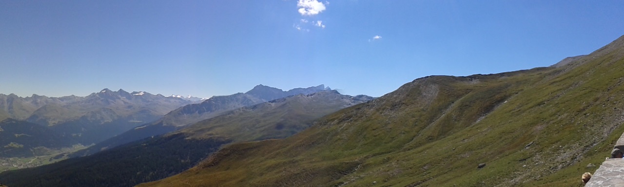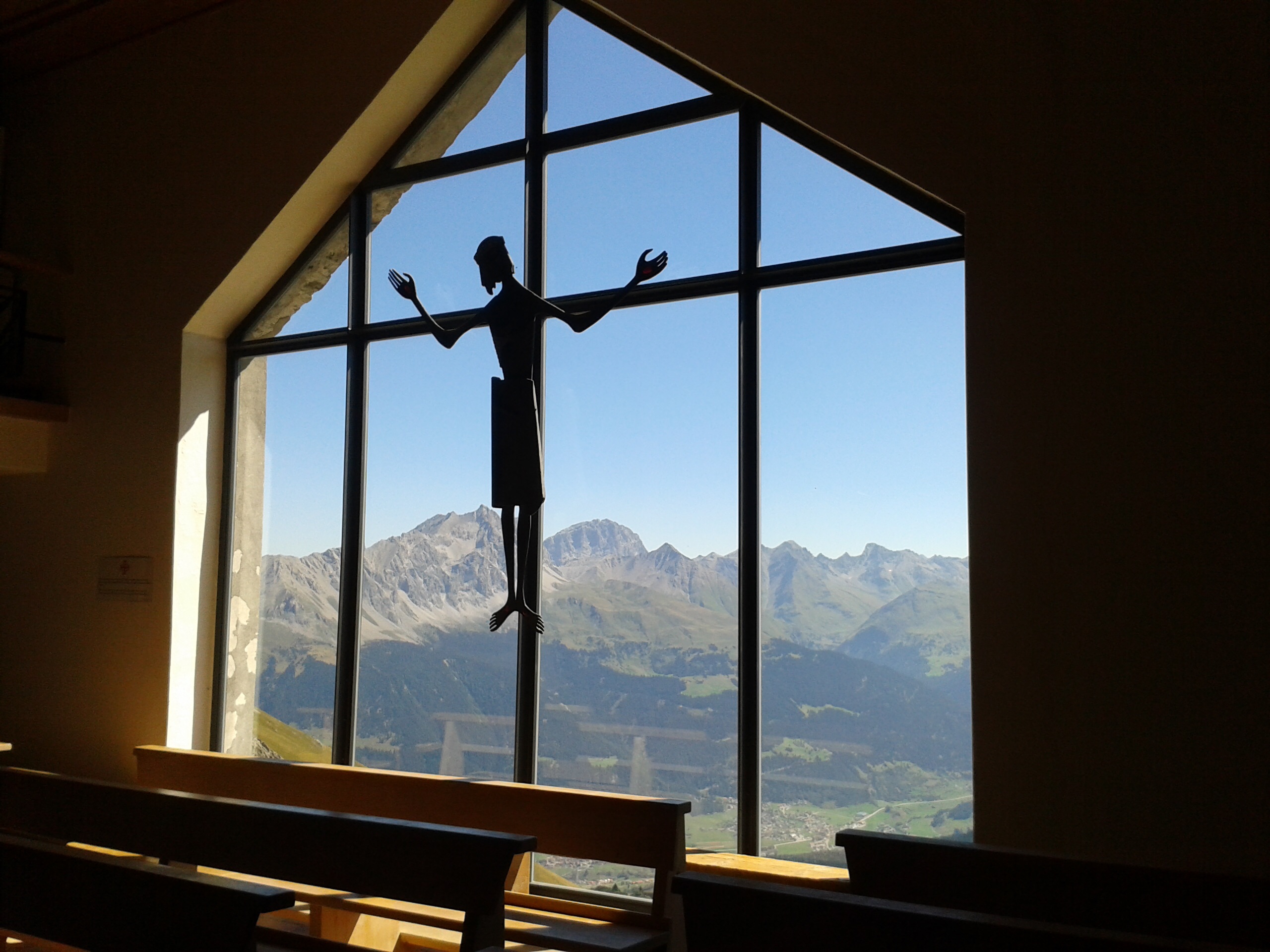 Der Kaffee und meine Brotzeit schmecken wunderbar. Die Kirche schaue ich mir an und bin fasziniert von dem Fenster, oder von seiner Aussicht. Zur linken der Blick auf die Errgruppe und im rechten Fensterteil die Aussicht Richtung Engadin, Piz Bernina, Rosegg Gletscher, Muottas Muragl. Ob wohl jeder Pilger und Gläubiger mit dieser Klarheit im Geist und im Herzen, wie an diesem traumhaften Tag, seinen Rückweg wieder antreten konnte?