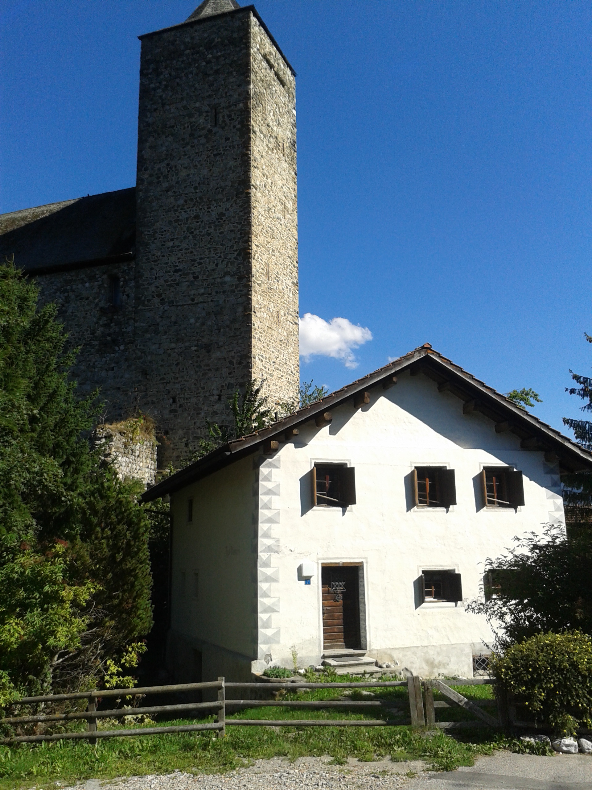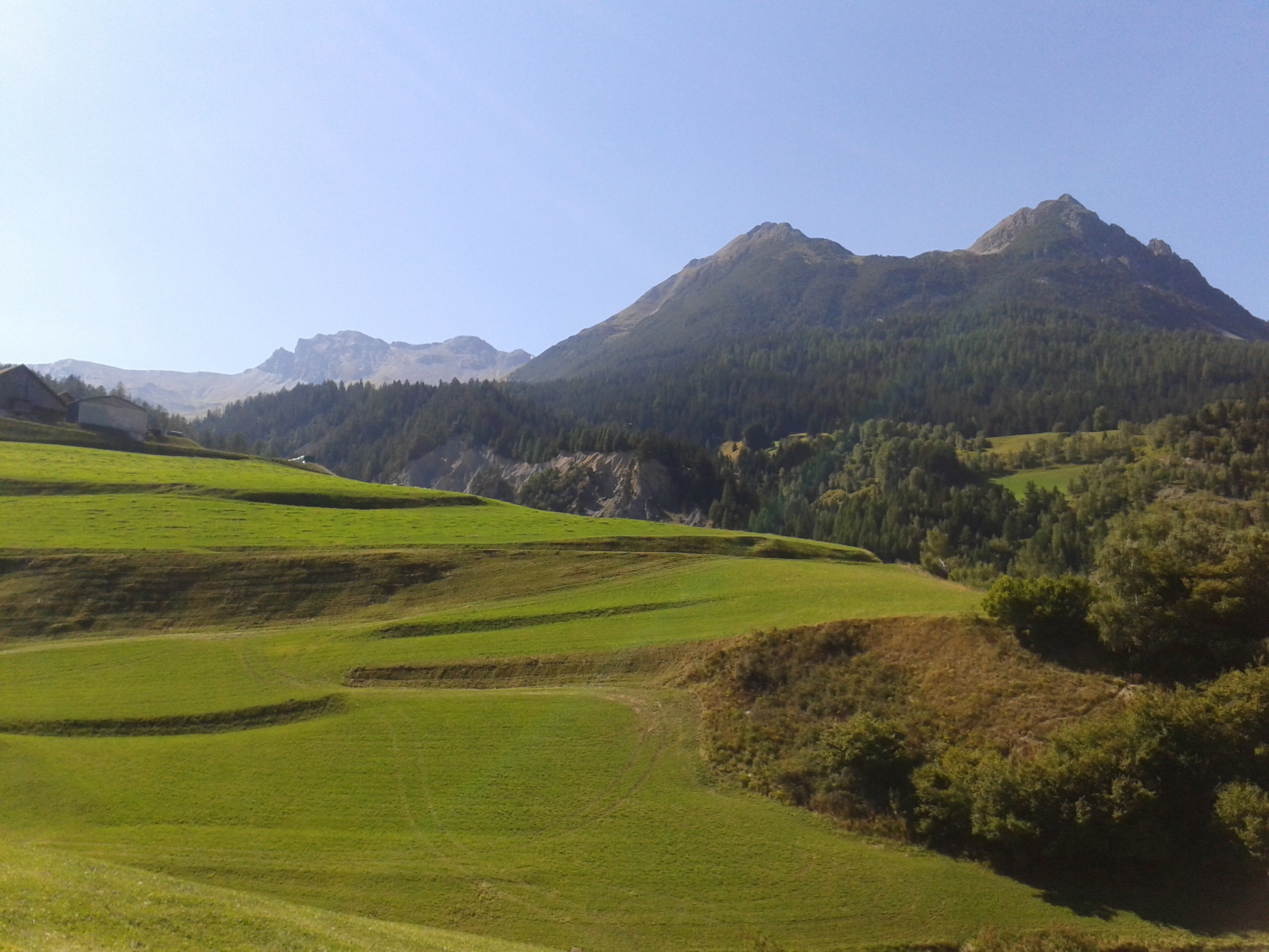 Den steilen Weg laufe ich wieder hinunter, Richtung Salouf. Oberhalb von Salouf entscheide ich mich, nicht mit dem Postauto zurückzufahren. Wer weiss, wann das fährt.. Gehe dann weiter nach Riom. Kaufe mir ein Eis und frage nach dem schöneren Weg Richtung Savognin. Er führt mich an der Burg in Riom vorbei, über die terrassenförmigen Wiesen, die der Grund meiner Wanderung hier sind und zum See in Savognin, zurück zur Talstation der Bergbahn.