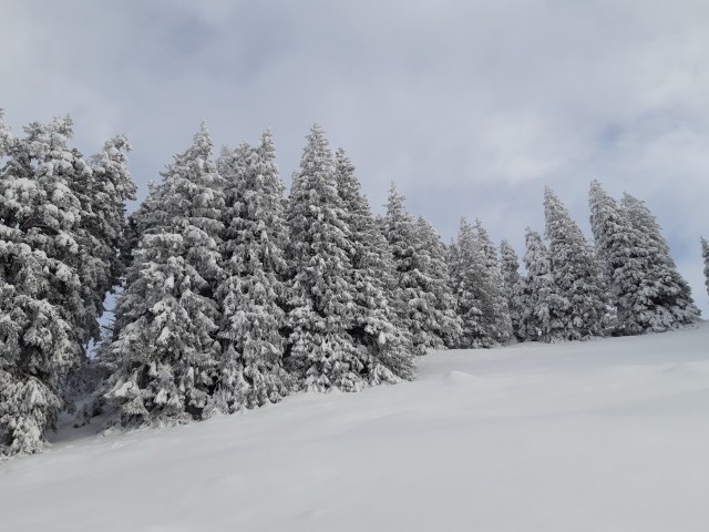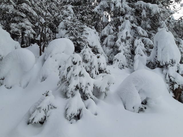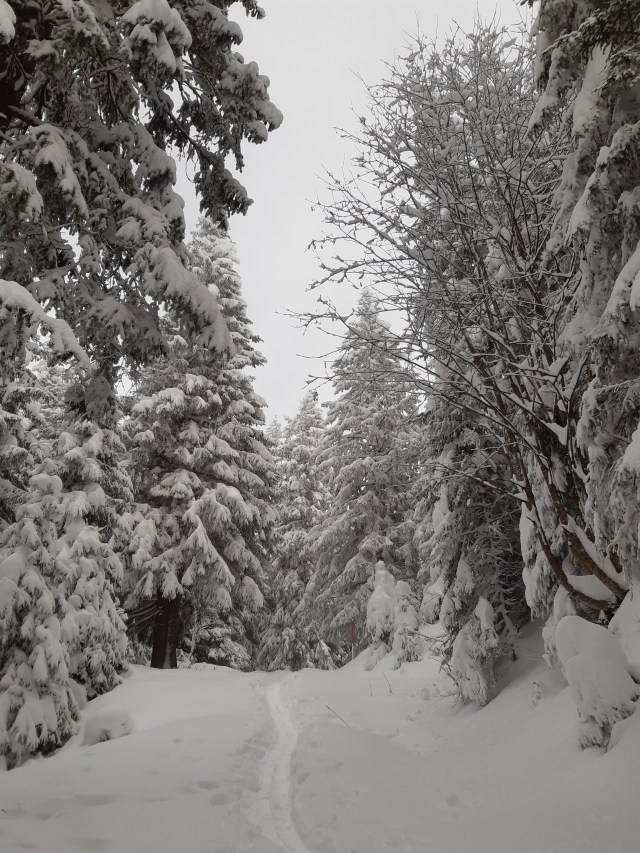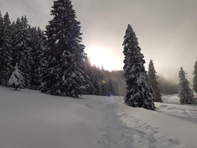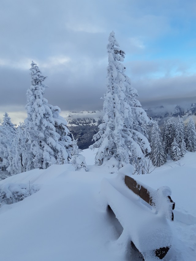 Die Bäume um dich herum, unter der Last des Schnees scheint es, als würden sie ihre Flügel hängen lassen