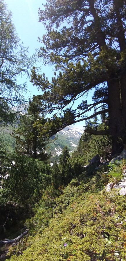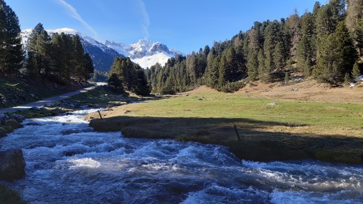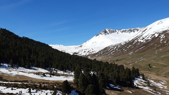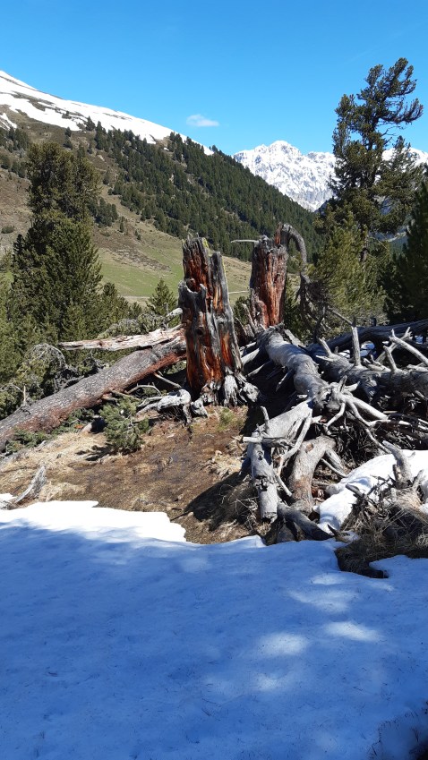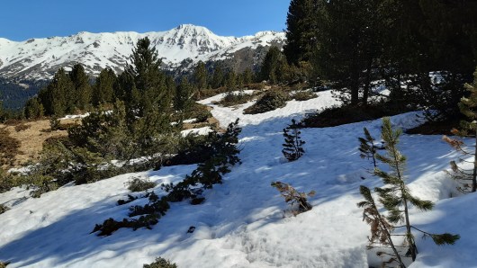 Beim Aufstieg zur Es-cha Hütte von Madulain / Engadin, wird der zarte Schatten der Lärchen und Arven an diesem warmen Frühlingstag dankbar angenommen.